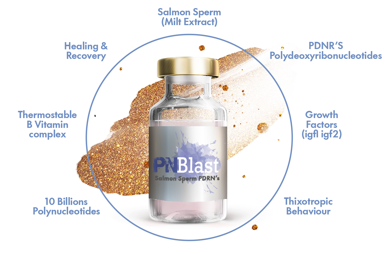 PnBlast is an advanced regenerative mesococktail specifically developed to restore skin health and quality. Its formulation, based on ultra-purified polynucleotides (PDRN) from salmon sperm, enriched with Vitamin B complex (B6, B12) and growth factors (IGF-1, IGF-2), supports deep cellular repair, collagen synthesis, and tissue regeneration.